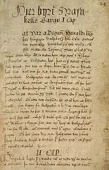 The precise time of composition of the saga also remains unknown, but the late 13th century seems most likely.[lower-alpha 6][14] The oldest extant manuscript uses vellum from the first half of the 15th century, but unfortunately only one page remains. Paper copies made from the complete manuscript preserve the full text of the saga.[5][15] The partially extant skin manuscript may well have copied the original composition directly. In any case the saga seems faithful to the original, with little rewriting and few accidental errors.[16][lower-alpha 7]