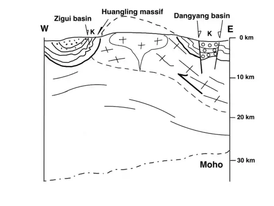 - During Lower Mesozoic, the northern notch of Qinling-Dabie belt and the clockwise rotation of the Sichuan Basin squeezed Huangling massif to escape to the east, forming an asymmetric ramp anticline trending N-S with steeper eastern flank and gentler western flank.[3] Controversy arose that the eastern flank of the anti-dome is steeper than the western flank, which is not fitting the geometry of Huangling complex.[30][31]