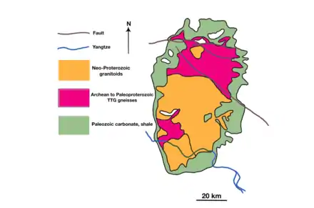 The Archean metamorphic rock was intruded by magma in the Neoproterozoic. It forms the core which exhibits an asymmetric dome-shape trending in a north-south direction.[3] The basement rock found in the northern part of the dome is called the Archean Kongling Complex. Magma intrusion made the northeastern part of the dome to be the Neoproterozoic granite.[8] During Archean, Kongling Complex experienced three periods of magmatic activities that shaped the basement of Huangling Complex. The oldest rock Kongling Complex dated with zircon was formed 3.2–3.3 Ga dated. The oldest part of the formation does not show much exposure. The rocks formed a bit later, at 2.9 Ga, are widespread. The widespread old metamorphic basement rocks are TTG gneisses and trondhjemitic gneiss; they are well-exposed. To the east of Huangling Complex, granitic and granodioritic schists can be found; they were formed at 2.7 Ga.[8]