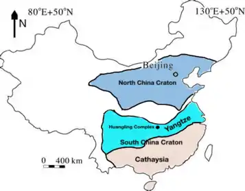 Huangling Complex represents a group of rock units appear in the middle of Yangtze Block in South China,[1] distributed across Yixingshan, Zigui, Huangling and Yichang counties.[2] The group of rock involves nonconformity that sedimentary rocks overlie the metamorphic basement.[3] It is a 73-km long, asymmetrical dome-shaped anticline with axial plane orientating in north-south direction. It has a steeper west flank and a gentler east flank.[3] Basically, there are three tectonic units from the anticline core to the rim, including Archean to Paleoproterozoic metamorphic basement, Neoproterozoic to Jurassic sedimentary rocks and Cretaceous fluvial deposit sedimentary cover.[2] The northern part of the core is mainly tonalite-trondhjemite-gneiss (TTG) and Cretaceous sedimentary rock, it is called the Archean Kongling Complex.[4] The middle of the core is mainly the Neoproterozoic granitoid. The southern part of the core is the Neoproterozoic potassium granite.[5] Two basins are situated on the western and eastern flanks of the core respectively, including the Zigui basin and Dangyang basin. Both basins are synforms while Zigui basin has a larger extent of folding. Yuanan Graben and Jingmen Graben are found within Dangyang Basin area.[3] Huangling Complex is an important area that helps unravel the tectonic history of South China Craton because it has well-exposed layers of rock units from Archean basement rock to Cretaceous sedimentary rock cover due to the erosion of the anticline.[6]