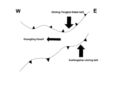 In the Early Mesozoic, as the South China Craton subducted beneath the North China Craton, the accumulation of continental material facilitates orogenic belt forming at the collision area.[25] Examples include the Qinling-Tongbai-Dabie belt, Longmenshan thrust belt and Indochina belt. The Xuefengshan-Jiuling belt lying in the middle of the South China Craton also formed due to the compressive force. Huangling massif was quite stable because its location in the middle of South China Craton was shielded from the uplift orogenic events at the rim.[3]