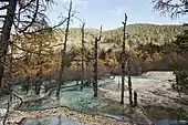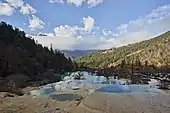 Huanglong (simplified Chinese: 黄龙; traditional Chinese: 黃龍; pinyin: Huánglóng; lit. 'yellow dragon') is a scenic and historic interest area in the northwest part of Sichuan, China. It is located in the southern part of the Minshan mountain range, 370 kilometres (230 mi) north-northwest of the capital Chengdu.[1] This area is known for its colorful travertine pools formed by calcite deposits, especially in Huanglonggou (Yellow Dragon Gully), as well as diverse forest ecosystems, snow-capped peaks, waterfalls and hot springs. Huanglong is also home to many endangered species including the giant panda and the Sichuan golden snub-nosed monkey.[1] In addition, a large population of the endemic orchid species 'Cypripedium plectrochilum' was discovered at the site [2] Huanglong was declared a World Heritage Site by UNESCO in 1992 because of its outstanding travertine formations, waterfalls and limestone formations as well as its travertine terraces and lakes rating among the three most outstanding examples in the world. [1][3]