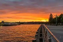 Pier 63 was originally located near 23rd Street, adjacent to Chelsea Piers and Hudson River Park. The site was formerly the location of a Pavonia Ferry terminal that opened in 1869. The ferries traveled to Jersey City, located opposite Manhattan.[68] By the beginning of the 20th century ferries were already aging and deteriorating under heavy use,[69] and in 1942 the terminal itself was demolished.[70] The pier then housed a Baltimore and Ohio Railroad transfer barge. In the late 1980s, boat enthusiast John Krevey converted an old railroad barge on the Hudson River to Pier 63.[71] A restaurant was opened on the pier. The lightship Frying Pan and the fire vessel John J. Harvey were also originally moored to Pier 63,[72] with both listed on the National Register of Historic Places.[73] In 2007, the barge was moved to Pier 66 on 26th Street.[74]