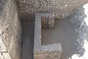 On top of this structure there are several rooms, with access from a central hallway. The floor and wall remains have traces of red painted stucco. There are three square holes probably used as braziers, for cooking and heating purposes.[1]