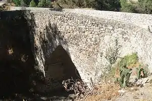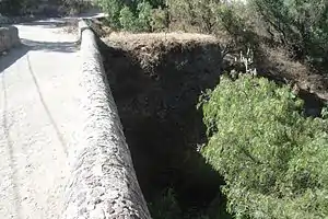 This structure is represented by a stone masonry pre-Hispanic bridge. Its overall length at the top is about 21.5 meters long by 4.9 meters wide (70 by 16 ft.). It has an equilateral pointed arch type construction, measures some 16 meters long, by 5 meters wide. The bridge top is about 15 meters over the ravine and river below and has a clear span of about 7 meters and it keystone is about 8 meters high.[1]