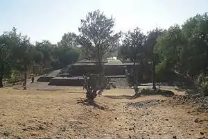 This structure represents remains of a defensive wall that probably surrounded the city. The structure measures about 6 meters high; with battlement protrusions extending two to three meters above. The walls are tapered with a width of about three meters at the bottom tapering down to about one meter at the top.[1]