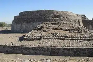 Ehécatl round temple probably used for ceremonial purposes, measuring some 15 meters in diameter. The structure has three stacked concentric round stages.[1]