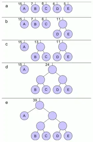 2. Create a new internal node, with the two just-removed nodes as children (either node can be either child) and the sum of their weights as the new weight.