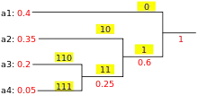 A source generates 4 different symbols with probability . A binary tree is generated from left to right taking the two least probable symbols and putting them together to form another equivalent symbol having a probability that equals the sum of the two symbols. The process is repeated until there is just one symbol. The tree can then be read backwards, from right to left, assigning different bits to different branches. The final Huffman code is: