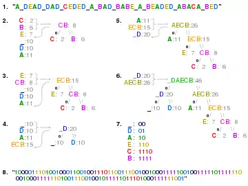 Visualisation of the use of Huffman coding to encode the message "A_DEAD_DAD_CEDED_A_BAD_BABE_A_BEADED_ABACA_