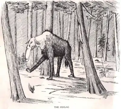 In American folklore, the hugag is a fearsome critter resembling a large terrestrial mammal, quadruped, with an extensive upper-lip, preventing it from grazing, and joint-less legs preventing it from lying down.[1][2][3][4]