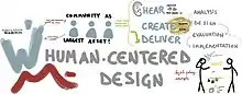 Human-centered design builds upon participatory action research by moving beyond participants' involvement and producing solutions to problems rather than solely documenting them. Initial stages usually revolve around immersion, observing, and contextual framing in which innovators immerse themselves with the problem and community. Subsequent stages may then focus on community brainstorming, modeling and prototyping, and implementation in community spaces.[1] Further, human-centered design typically focuses on integrating technology or other useful tools in order to alleviate problems, especially around issues of health.[2] Once the solution is integrated, human-centered design usually employ system usability scales and community feedback in order to determine the success of the solution.