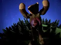 As Björk continues to sing, she appears walking in the forest, seemingly followed by the bear. A frame shows a nest full of Björk-like humans trapped in a pupa. When the bear and the singer meet, the animal makes the motion of roaring at her. She starts to fly through the forest, and during the flight she clings to a tree. The tree collapses, she falls down near the Hunter still lying supine on the ground, and she appears on the ground having the same dimensions of the hedgehog. Then, the situation of the opening frames is repeated, as Björk tries to cross the road and manages not to get hit by the car, driven by the Bear. In the following scenes, she sings in a river in the middle of the forest. While she contemplates the sky, the Moon appears to emanate pulsations, and the perspective shifts to what appears to be a moth. Now on the moon, the singer is shown dressed as an astronaut, while she's planting a Soviet flag.