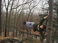 The human flag or bar hold is a feat of strength where the body is parallel to the ground supported by a vertical bar. A straight line is formed using the arms and body. The trick requires the performer to have extensive upper body strength.