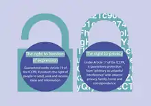 Restrictions on the right to freedom of expression are only permitted under the conditions of Article 19, paragraph 3. Restrictions shall be provided for by law and they shall be necessary (a) for the respect of the rights or reputations of others or (b) for the protection of national security or of public order or of public health or morals.[1] A further possibility for restriction is set out in Art. 20 ICCPR,[48] In the context of limitations on cryptography, restrictions will most often be based on Article 19 (3)(b), i.e. risks for national security and public order. This raises the complex issue of the relation, and distinction, between security of the individual, e.g. from interference with personal electronic communications, and national security. The right to privacy[49] protects against 'arbitrary or unlawful interference' with one's privacy, one's family, one's home and one's correspondence. Additionally, Article 17(1) of the ICCPR protects against 'unlawful attacks' against one's honor and reputation.[1] The scope of Article 17 is broad. Privacy can be understood as the right to control information about one's self.[50] The possibility to live one's life as one sees fit, within the boundaries set by the law, effectively depends on the information which others have about us and use to inform their behavior towards us. That is part of the core justification for protecting privacy as a human right.[1]