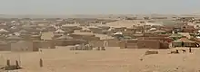 In October, thousands of Sahrawis fled from El Aaiun and other towns to the outskirts of Lemseid oasis (Gdeim Izik), raising up a campament of thousands of "jaimas" (Sahrawi tents) called the "Dignity camp", in the biggest Sahrawi mobilization since the Spanish retreat.[131] They protest for the discrimination of Sahrawis in labor and for the exploitation of the natural resources of Western Sahara by Morocco.[132] The protest, that started with a few jaimas on 9 October, grew up to more than 10,000 persons on 21 October.[133] Other campaments were erected in the outskirts of Bojador, Smara and El Aaiun, but were disbanded by Moroccan police. The "Gdeim Izik" campament was surrounded by troops of the Moroccan Army and policemen, who made a blockage of water, food and medicines to the camp.[134][135] On 24 October, a SUV that was trying to enter the camp was machine-gunned by Moroccan soldiers, killing Elgarhi Nayem, a 14-year-old Sahrawi boy, and wounding the other five passengers.[136] The Moroccan Interior ministry claimed that the SUV was gunned after shots rang out of the vehicle,[137] which was denied by their families. According to Sahrawi sources, Elgarhi was buried in secret by the Moroccan authorities, without autopsy or the consent of his family.[138] By that days, the camp had grow to more than 20,000 inhabitants. The Moroccan Army had encircled the camp with a wall of sand and stones, controlling the only access to the camp.[139] On 31 October, Tiago Viera (president of the World Federation of Democratic Youth) was expelled from El Aaiun airport, first to Casablanca and then returned to Lisbon, for alleged "irregularities" when he was trying to visit the camp.[140] Also that day, eight Spanish activists that also tried to reach Gdeim Izik were retained by Moroccan police on a boat in the port of El Aaiun, when they were confronted by a crowd of Moroccans who make death-threats on them. Police stated that they cannot guarantee their safety, and denied them entering the territory, so they had to return to Las Palmas.[141] On 6 November, three Spanish regional MP's that tried to visit the "Dignity camp" were retained in Casablanca and expelled to Spain the next day without any explanation.[142]