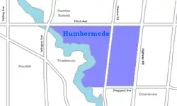 Humbermede, often called Emery, is a neighbourhood of Toronto, Ontario, Canada. Humbermede, like many of the "Humber" neighbourhoods in the city, gets its name from the Humber River. It is bounded on the west by the Humber River, on the north by Finch Avenue West, on the east by the Highway 400 and on the south by Sheppard Avenue West.