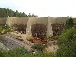 To create this reservoir, John S. Eastwood was hired in 1908 to construct a dam at Long Meadow.[2] Eastwood proposed constructing the world's first reinforced concrete multiple arch dam. Although unprecedented, at a cost of approximately $46,000, the dam's design was a less expensive alternative to a conventional rock fill dam that would have cost about twice as much to construct. The dam was completed in only 114 days, by the end of 1909, along with a mill immediately adjacent to the dam.[3] Logs were dumped into the reservoir by rail and floated to the dam where they were drawn up into the mill, cut and then dried in kilns next to the mill on the west bank of Tenmile Creek. From this location, lumber was floated to Sanger, California, in a flume filled with water from the reservoir. The flume was the longest ever created, eventually stretching 73 miles (117 km) from Hume Lake to Sanger.[4] Designed and built by James Carroll Goss, the flume was used by both the lumber company and tourists. Thrill seeking tourists would occasionally ride in the flume down from the Sierras in special boats designed with an open prow so that water would help keep the boats from flying off into the air. The flume was also reputedly utilized in 1893 by the bandit Chris Evans, of the Evans-Sontag Gang of Train Robbers, who hid along the flume to evade capture after escaping from the Fresno County Jail with his accomplice Ed Morrell.[5]