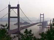 The Humen Pearl River Bridge (simplified Chinese: 虎门大桥; traditional Chinese: 虎門大橋; pinyin: Hǔmén Dàqiáo; Jyutping: Fu2mun4 Dai6kiu4) is a bridge over the Humen, Pearl River in Guangdong Province, southern China. It consists of two main spans - a suspension bridge section and a segmental concrete section. It connects the Nansha District of Guangzhou to Humen Town of Dongguan. Completed in 1997, the suspension bridge has a main span of 888 meters, and the segmental concrete section's main span of 237 meters is among the longest such spans in the world.[2] It forms part of the G9411 Dongguan–Foshan Expressway.[3] A newer bridge known as Nansha Bridge (Chinese: 南沙大桥), built to reduce the traffic problems on the Humen Bridge, opened to traffic in April 2019.[4][5]