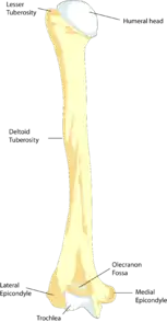 The humerus (/ˈhjuːmərəs/; pl. humeri) is a long bone in the arm that runs from the shoulder to the elbow. It connects the scapula and the two bones of the lower arm, the radius and ulna, and consists of three sections. The humeral upper extremity consists of a rounded head, a narrow neck, and two short processes (tubercles, sometimes called tuberosities). The body is cylindrical in its upper portion, and more prismatic below. The lower extremity consists of 2 epicondyles, 2 processes (trochlea & capitulum), and 3 fossae (radial fossa, coronoid fossa, and olecranon fossa). As well as its true anatomical neck, the constriction below the greater and lesser tubercles of the humerus is referred to as its surgical neck due to its tendency to fracture, thus often becoming the focus of surgeons.