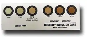 A humidity indicator card (HIC) is a card on which a moisture-sensitive chemical is impregnated such that it will change color when the indicated relative humidity is exceeded. This has usually been a blotting paper impregnated with cobalt(II) chloride base; Less toxic alternatives include other chemicals such as cobalt-free chloride base and special plastic films.[1]