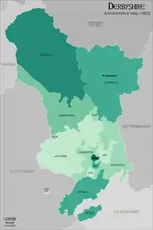 The Hundreds of Derbyshire were the geographic divisions of the historic county of Derbyshire for administrative, military and judicial purposes. They were established in Derbyshire some time before the Norman conquest. In the Domesday Survey of 1086 AD the hundreds were called wapentakes.[1] By 1273 the county was divided into 8 hundreds with some later combined, becoming 6 hundreds over the following centuries.[2] The Local Government Act 1894 replaced hundreds with districts.[3] Derbyshire is now divided into 8 administrative boroughs within the Derbyshire County Council area.[4]