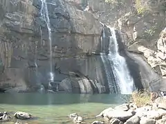 The Hundru Falls at one of the edges of the Ranchi plateau is one of the several scarp falls in the region.[8] During rainy season it takes a formidable form but in the dry season it turns into an exciting picnic spot.[9] At the base of the Hundru Falls, there is a pool, which serves as a bathing place.[5]