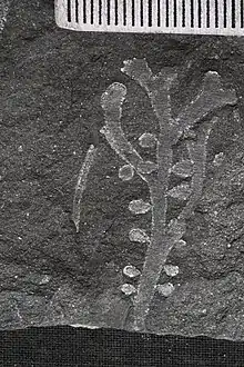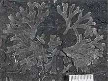Hungerfordia is a genus of presumed marine algae first described by Fry and Banks in 1955 in describing Hungerfordia dichotoma from Late Devonian strata.[2] It has been interpreted as a probable brown (Phaeophyte) algae[2] though the possibility that it represents a red (Rhodophyte) alga is not excluded[3][4] - the taxonomic challenge being that modern red and brown algae are differentiated on the basis of colour and cellular structure which are not preserved in the fossil taxa (Hiller and Gess, 1996, Gess and Whitfield). Douglas and Jell (1985) suggested that Buthotrephis trichotoma and B. divaricata[5] should furthermore be transferred from Buthotrephis to Hungerfordia.[6] A further species, Hungerfordia fionae from the Late Devonian of South Africa is known from the largest sample, analysis of which suggests that variations used to differentiate between H. dichotoma and H. trichotoma may represent growth variations accountable by a single taxon.[3] Hungerfordia fionae fossils are as yet only recorded from the Waterloo Farm lagerstätte in Makhanda, Eastern Cape, South Africa and were first mentioned in the literature in 1991 as ‘terminally-lobed algae’ by Fiona Taylor.[3] With further excavations, in subsequent years, hundreds of specimens of Hungerfordia have been collected, which are housed within the Devonian Ecosystems Laboratory, Albany Museum in Makhanda, Eastern Cape - (with further good examples still being added to the collection during ongoing excavations (2021) by the research team of the Devonian Ecosystems Project). Hungerfordia fionae comprises dichotomous axes and is differentiated from other species by the presence of small bud-like appendages along the margins, which are preserved in a minority of specimens, and may more commonly have been shed in life or during transport. These have been compared to buds produced during the fertile phase of modern Rhodophyte algae.[3] It is believed that H. fionae probably lived in the more marine dominated portion of the Waterloo Farm estuarine system and were drifted further into the estuarine lake system through tidal action. Here they were preserved in large numbers due to anoxic bottom water and still water conditions that allowed for unusual preservation of soft tissues.[4] They are often preserved alongside charophyte algae, representative of fresh to brack conditions, demonstrating the dynamic salinity clines in the estuarine environment, as well as fragments of terrestrial plants and estuarine fauna.[4]