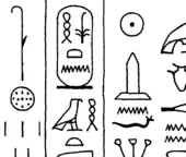 The older version uses the hieroglyphic signs candle wick (Gardiner sign V28), juncus sprout (Gardiner sign M23), bread loaf (Gardiner sign X1) and water line (Gardiner sign N35). This writing form can be found on Old Kingdom objects such as the Palermo Stone recto (reign of Neferirkare), the tomb inscription of Metjen, the stone vessel found in Abusir and the granite cone from Elephantine. Whilst the stone vessel from Abusir writes Huni's name without a cartouche, but gives the Niswt-Bity-title, all other Old Kingdom writings place the king's name inside an oval cartouche.[11]