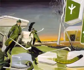 Hunt (German: Hatz) is a 2002 painting by the German artist Neo Rauch. It depicts a group of flying men in green coats and hats playing ice hockey among large ice cubes.