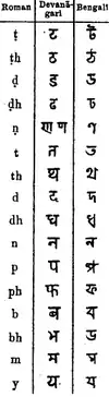 ... the use of c alone for this sound ... though it may be easy for specialists to attach an arbitrary sound to a letter, the public can hardly be expected ... Every map and geographical text book has adopted 'ch', as does the roll of every Indian regiment and every revenue record ... chh is the analogous aspirate of this, unless we adopt for it čh ... Table: The Principal Indian Alphabets ...