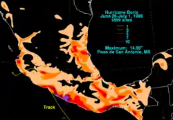 A total of about 10,000 people were left homeless, and at least 70 people were injured.[5] Damage is unknown.[4] Rain was heavy throughout the impacted region, with the highest totals in Guerrero. A total of 12.16 inches (309 mm) was recorded in Coyuca de Benítez.[1] The highest total was 14.98 inches (380 mm) at Paso de San Antonio, to the east of the point of landfall.[6] Those rains caused a flood on the San Jeronimo River, which left at least 5000 homeless. In Tecpan, a countless number of homes were washed away.[1] Winds went as high as 90 miles per hour (140 km/h).[7] The storm flooded lobbies of hotels along the coast. Approximately 12 boats were sunk offshore. Tecpan bore the brunt of the storm, reporting heavy damage.[8] The area was impacted by Hurricane Alma just a few days before.[9] On July 18 the President of Mexico had a meeting for the victims of Boris and Cristina, a storm later that season, in Acapulco, Mexico.[10]