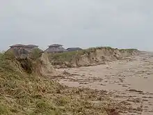 Severe beach erosion occurred from High Island to Freeport, though large geotextiles-tubes reduced the erosion on Galveston Island and the Bolivar Peninsula.[14] The outer bands of the hurricane spawned two tornadoes. One was an F1 on the Fujita scale that caused damage to several buildings in Palacios, and the other damaged homes in Port Lavaca.[1]