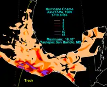 Prior to the hurricane's landfall, Mexican officials evacuated nearly 260 people from low-lying areas near Acapulco. Ports in the region were also closed several days before the storm and remained closed for two days after as a precaution.[6] In addition, flash flood watches and warnings were issued.[7] Cosme brought heavy rains, which killed at least 30 people due to drowning.[1] Many adobe homes were destroyed, but the specific cost of damage is unknown.[1] The highest rainfall recorded in relation to Cosme was 16.1 in (410 mm) in San Bartolo Yautepec, Mexico. Many mountainous areas received rainfall in excess of 7 in (180 mm) and most other areas received 1 in (25 mm).[8] High winds produced by the storm damaged numerous trees and power lines throughout the affected areas.[9] Authorities in Acapulco stated that there were no major damage or injuries from the storm, with only one hotel sustaining minor damage.[10][11]