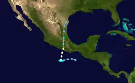 During the night of June 21, Cosme made landfall just east of Acapulco. It moved inland and quickly deteriorated, weakening into a tropical storm shortly after coming ashore.[2] It trekked northward through eastern Mexico and further diminished into a tropical depression before becoming indistinguishable south of Brownsville, Texas on June 23. Tropical Storm Allison's development in the Gulf of Mexico was partially related to residual conditions from Cosme's remnants.[1]