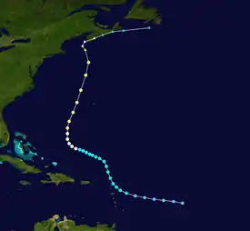 A Television Infrared Observation Satellite (TIROS) revealed the presence of a tropical disturbance east of the Leeward Islands on September 28.[1] A reconnaissance aircraft flight into a system on the following day indicated that a tropical depression developed near 14.5°N, 48.9°W. The depression initially moved west-northwestward and remained disorganized for several days. In the early stages of the depression, the system appeared to have been located under minor vortices in the upper atmosphere, located within a strong east–to–west oriented trough.[2] Approaching the Lesser Antilles, the system curved northwestward between two high pressure areas on September 30 and avoided landfall in the islands.[2][3] By October 2, the depression strengthened into Tropical Storm Daisy. The trough dissipated on the following day, causing Daisy to resume its initial west-northwest motion. The storm intensified into a Category 1 hurricane later on October 3.[2][3] Further deepening occurred, and by October 5, Daisy became a Category 2 hurricane.[3]