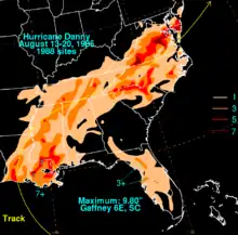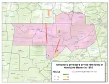 Overall, Danny killed five people[3][6] and left $50 to $100 million (1985 USD) in damage[1] along with 73 injuries.[7] Danny also produced an unusually intense outbreak of tornadoes, with a total of 39 touchdowns occurring over seven states.[8] Two tornadoes were reported in Louisiana, 2 in Mississippi, 34 in Alabama, three in Tennessee, four in Georgia, one in South Carolina, and three in North Carolina.[9] Danny's outbreak contained a then-record 13 significant tornadoes spawned by a hurricane; however, since then, Hurricane Ivan surpassed this, producing 18 significant tornadoes.[8] Moderate to heavy rainfall fell to the east of the track while Danny remained tropical. As it was transitioning into a frontal wave across the Eastern United States, heavy rainfall became focused to the left of its track, overrunning the frontal surface ahead of the storm.[9]
