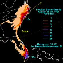 ![]() Hurricane Dennis near peak intensity off the coast of Maryland on August 20, 1981 | |