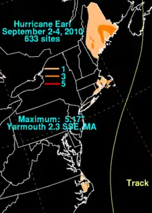 On August 31, several days prior to Earl's passage, rough seas produced by the storm killed a man in Massachusetts after he was knocked off rocks and pulled out to sea.[141] Late on September 3, a weakened Tropical Storm Earl brushed New England, with its center passing roughly 90 mi (140 km) south-southeast of Nantucket, Massachusetts.[142] During the height of the storm, heavy rains and winds up to 58 mph (93 km/h) buffeted the coastline.[143] In Yarmouth, a total of 5.17 in (131 mm) of rain fell during the storm, the highest in the state.[144] Throughout the state, roughly 1,800 residences, roughly 600 of which were on Cape Cod, lost power due to downed trees and power lines.[145] In the local harbors, most boats were unaffected by the storm; however, one did capsize.[143] The most significant losses were to businesses who lost their Labor Day weekend revenue. Several hotels estimated that 10% of the revenue was lost, this equates to hundreds of thousands of dollars.[145] One hotel in Yarmouth reported an 80% decrease in attendance despite a price cut from $130 to $85.[146] On the other hand, supply stores saw improved sales, experiencing a 20% increase in revenues.[145] Due to the lack of major damage from the storm, most businesses reopened on September 4 and tourists resumed their weekend plans.[147] Throughout the state, Earl left $20,000 in damage.[148]