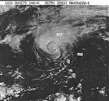 ![]() Hurricane Ella at its initial peak intensity southeast of Cape Hatteras on September 1 | |