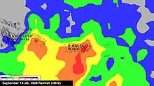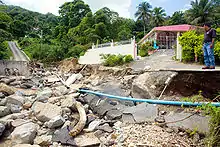 The precursor to Kyle produced record breaking rains over Puerto Rico from September 21 to 23.[24] With isolated maxima in excess of 30 inches (760 mm), rivers breached their flood walls and flooded low-lying areas.[15] In Patillas, a 500-year 24‑hour rainfall event took place, with 22.03 in (559.5 mm) falling from 8 a.m. on September 21 to 8 a.m. on September 22.[25] Some rivers rose more than 25 ft (7.6 m) in 12 hours, leading to severe flooding.[26] Three deaths were directly blamed on the system as a result of the floods and mudslides.[1] Another three deaths were indirectly related due to stress induced heart attacks.[26] Mudslides, triggered by the torrential rain, closed highways and schools.[18] Damage to agriculture on the island was estimated to be $23 million and structural damage was estimated at $25 million, for a total of $48 million.[26][27] In addition to the system's rainfall, its winds whipped up 10 ft (3 m) waves along the island's southern coast.[28]