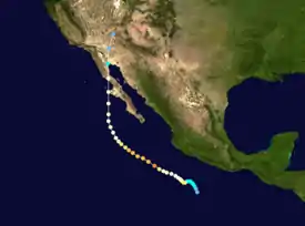 Hurricane Nora was only the third tropical cyclone on record to reach Arizona as a tropical storm, and one of the rare cyclones to make landfall in Baja California. Nora was the fourteenth named tropical cyclone and seventh hurricane of the 1997 Pacific hurricane season. The September storm formed off the Pacific coast of Mexico, and aided by waters warmed by the 1997–98 El Niño event, eventually peaked at Category 4 intensity on the Saffir–Simpson hurricane scale.