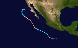 Hurricane Octave originated from a tropical wave that left west coast of Africa on August 21, 1989. Moving westward, the wave became better organized and developed into Atlantic Tropical Depression Nine on August 27. However, strong wind shear inhibited further development of the system, leading to it degenerating to a tropical wave. Upon weakening to wave, the system was situated roughly 400 mi (640 km) east of the Lesser Antilles. Continuing westward, the system moved through the Caribbean without significant development before crossing Central America and entering the Pacific Ocean on September 3. After remaining stationary for several days, the system was upgraded to a tropical depression on September 8 about 400 mi (640 km) south of the Mexican coastline. Upon becoming a tropical cyclone, the convection became well-organized.[1] Octave took a general northwestward track as it intensified, becoming Tropical Storm Octave later that day.[2]