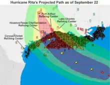 Concerns had been raised over the state of the oil industry in response to Rita. The storm threatened a large amount of oil infrastructure that was left undamaged by Katrina.[40] The Texas Gulf Coast is home to 23% of the United States' refining capacity, and numerous offshore production platforms were in Rita's path.[41] A direct strike on Houston could disable more than a quarter of the United States' fuel-making capacity.[42] Valero Energy Corp, the nation's largest refiner, stated on September 21 that Rita could have caused gasoline prices to rise well above $3 per US gallon ($0.79/L), at a time when the U.S. average price was $2.77/gal.[43]