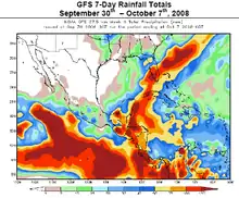 Rainfall forecast for Tropical Depression 16 as by the GFS model. The darker the color, the heavier the rain.