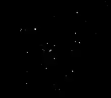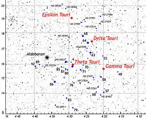 The five brightest member stars of the Hyades have consumed the hydrogen fuel at their cores and are now evolving into giant stars.[6] Four of these stars, with Bayer designations Gamma, Delta 1, Epsilon, and Theta Tauri, form an asterism that is traditionally identified as the head of Taurus the Bull.[6] The fifth of these stars is Theta1 Tauri, a tight naked-eye companion to the brighter Theta2 Tauri. Epsilon Tauri, known as Ain (the "Bull's Eye"), has a gas giant exoplanet candidate,[7] the first planet to be found in any open cluster.