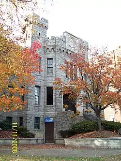 The Hyattsville Armory is a historic National Guard armory built in 1918 and located in Hyattsville, Prince George's County, Maryland, United States. It was the first Armory built in Prince George's County and the fifth in Maryland. Its architect, Robert Lawrence Harris, served as State Architect under Governor Albert C. Ritchie. In this capacity, Harris supervised the design of similar armories in Salisbury, Kensington, Silver Spring, Hagerstown, Laurel, Easton, Crisfield, Pocomoke City, Centreville, and Cumberland. The structure is distinctly fortresslike and offers a commanding view of the surrounding area. The building is patterned after a medieval English castle and built of native stone, with rectangular turrets flanking the arched limestone entranceway. Carved above the entry is the State Seal of Maryland.[2]