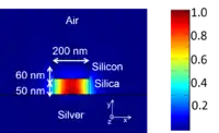 Dielectric waveguides use total internal reflection to confine light in a high index region. They can guide light over a long distance with very low loss, but their light confinement ability is limited by diffraction. Plasmonic waveguides, on the other hand, use surface plasmon to confine light near a metal surface. The light confinement ability of plasmonic waveguides is not limited by diffraction,[1] and, as a result, they can confine light to very small volumes. However, these guides suffer significant propagation loss because of the presence of metal as part of the guiding structure.[2] The aim of designing the hybrid plasmonic waveguide was to combine these two different wave guiding schemes and achieve high light confinement without suffering large loss. [3][4] Many different variations of this structure have been proposed. Many other types of hybrid plasmonic waveguides have been proposed since then to improve light confinement ability or to reduce fabrication complexity.[5][6]