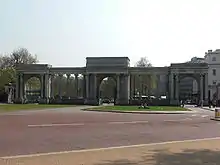 Following the construction of Buckingham Palace, the improvement plans were revisited. The grand entrance to the park at Hyde Park Corner was designed by Decimus Burton, and was constructed in the 1820s.[40] Burton laid out the paths and driveways and designed a series of lodges, the Screen/Gate at Hyde Park Corner (also known as the Grand Entrance or the Apsley Gate) in 1825[16] and the Wellington Arch, which opened in 1828.[41] The Screen and the Arch originally formed a single composition, designed to provide a monumental transition between Hyde Park and Green Park, although the arch was moved in 1883. It originally had a statue of the Duke of Wellington on top; it was moved to Aldershot in 1883 when the arch was re-sited.[41]