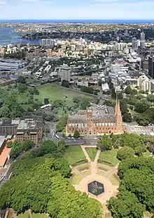 In 1832 William and Macquarie Street (southern extension) were constructed severing Hyde Park and establishing its central axis.[21] Also in 1832 College Street was built which divided off part of the park, in the area which became Cook and Phillip Parks. Also in 1832 Sydney College was built (later Sydney Grammar School). With the nearby Lyons Terrace (1851) and the Australian Museum (1849-51) the southern end of Hyde Park attracted significant and imposing buildings which increased its importance as a planned open space envisaged by Francis Greenway.[1][13]